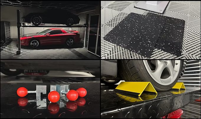 Accessory Bundle for Vehicle Lift | Set of 4 - 1" Lock Risers | Set of 4 Rubber Floor Pads | Set of 2 wheel Chocks | LED Light Kit