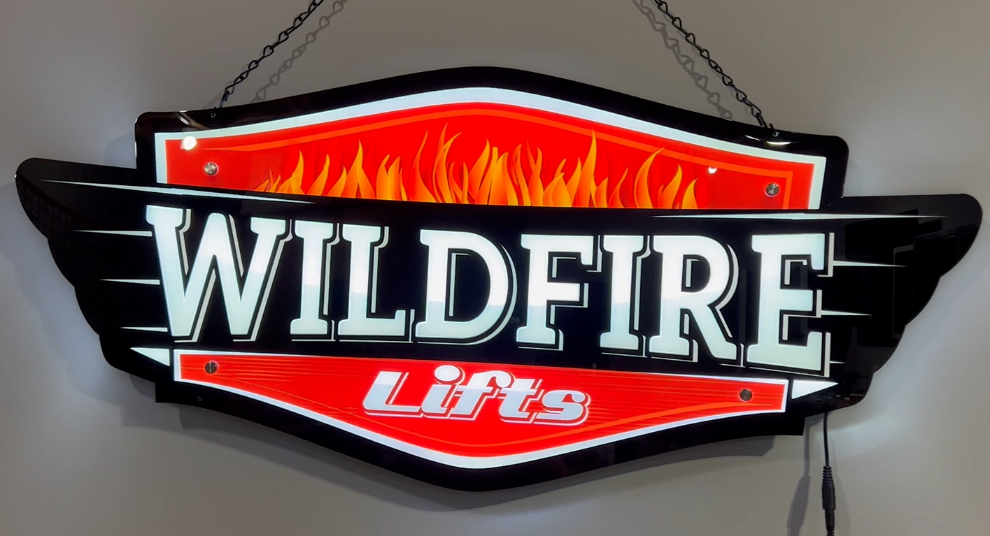 This stylish LED wall sign features the powerful colors of the Wildfire Lifts logo. The sign plugs into any standard house outlet and is sure to add fun to any garage.